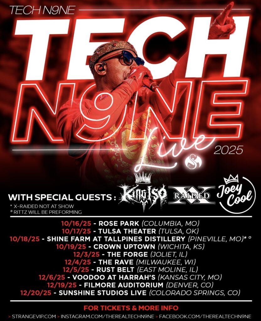 Tech N9ne is ready to scorch stages across the Midwest and Rocky Mountain region this fall and early summer with a slate of October and December dates with support from King Iso, X-Raided and Joey Cool. Most shows are already SOLD OUT, so these are some of the most sought after tickets getting around.