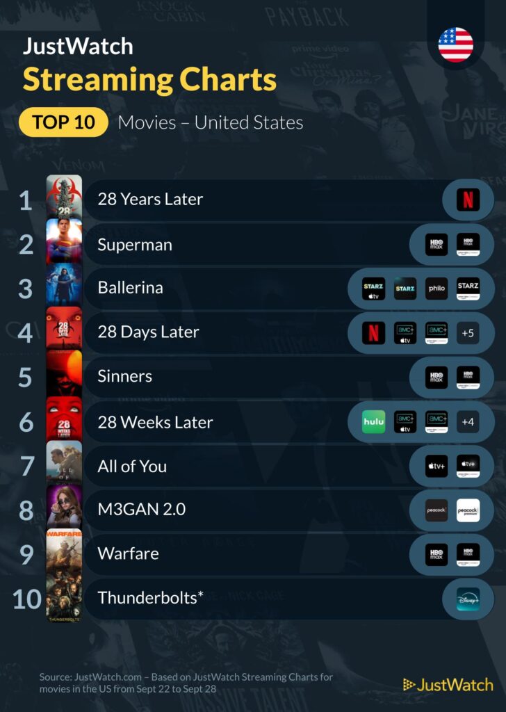 Over in film, Netflix’s 28 Years Later reigns supreme, giving fresh life to the iconic zombie franchise. Right behind it is DC’s Superman on HBO Max, still flying high after its debut. The Korean action hit Ballerina locks in third, followed by Danny Boyle’s classic 28 Days Later back in circulation.